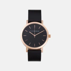 The Original watch featuring polished rose gold stainless steel case, black dial with minimalist rose gold markers, and a black genuine leather band. The Horse logo lettering on dial and at buckle closure.